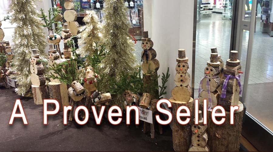 Handmade log Reindeer & Snowmen that make great add on sales for your retail stores, tree lots or garden centers. They are adorably cute each with unique features and distinct personalities. Customers pick them out as if they were pets. Add this new exciting product to your inventory. The reindeer & snowmen sell themselves and will increase your income tremendously.